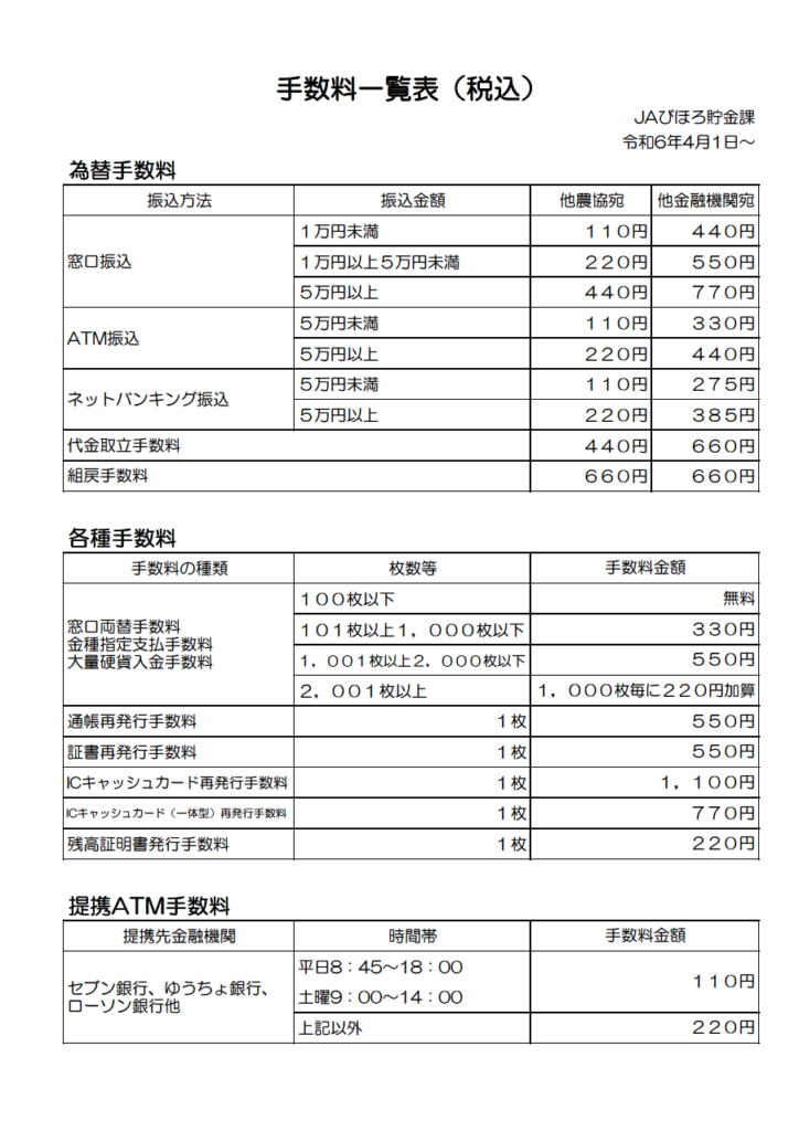 手数料の一覧表について