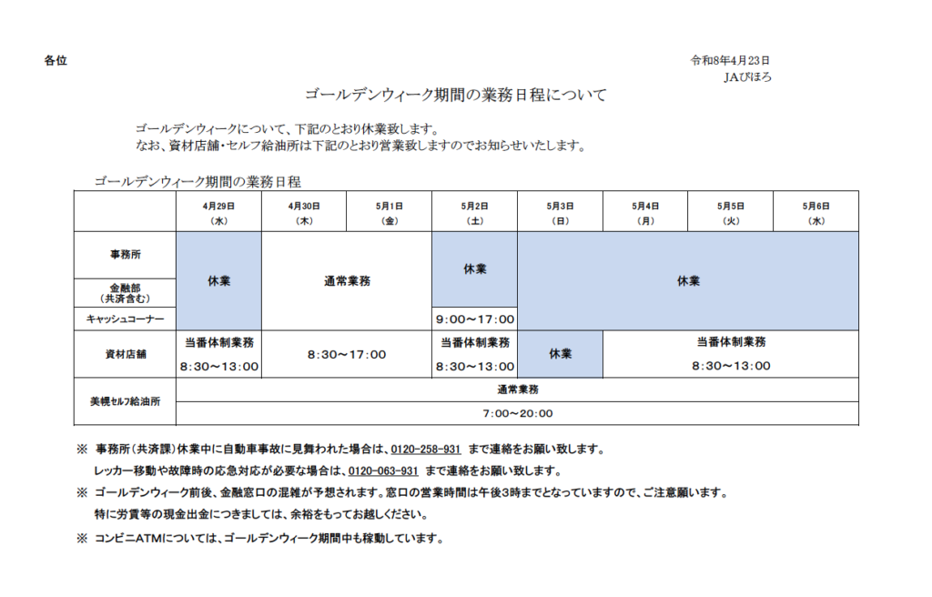 なお、資材店舗・セルフ給油所は下記の通り営業いたしますのでお知らせいたします。
